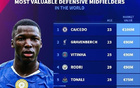 德转列防守型中场身价榜:凯塞多1亿欧居首,赫拉芬贝赫第二